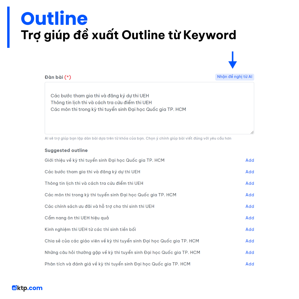 | Chỉ với một cú nhấp chuột, aiktp.com sẽ giúp bạn tiết kiệm nhiều giờ trong việc sáng tạo nội dung bằng danh sách các từ khoá liên quan, khung nội dung tham khảo gợi ý bởi AI | |